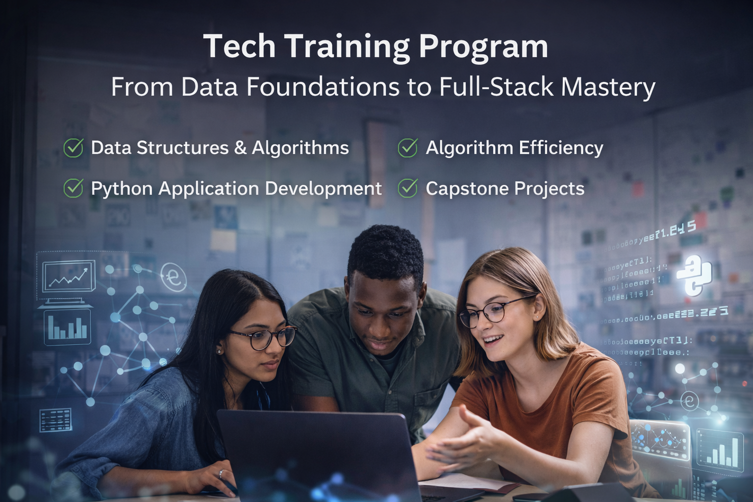 This Tech Training Program is a structured, multi-stage learning journey designed to transform undergraduate and postgraduate students into industry-ready developers. The program progresses from core data foundations and algorithmic thinking to full-scale Python application development, ensuring learners build strong fundamentals before moving into real-world implementation.